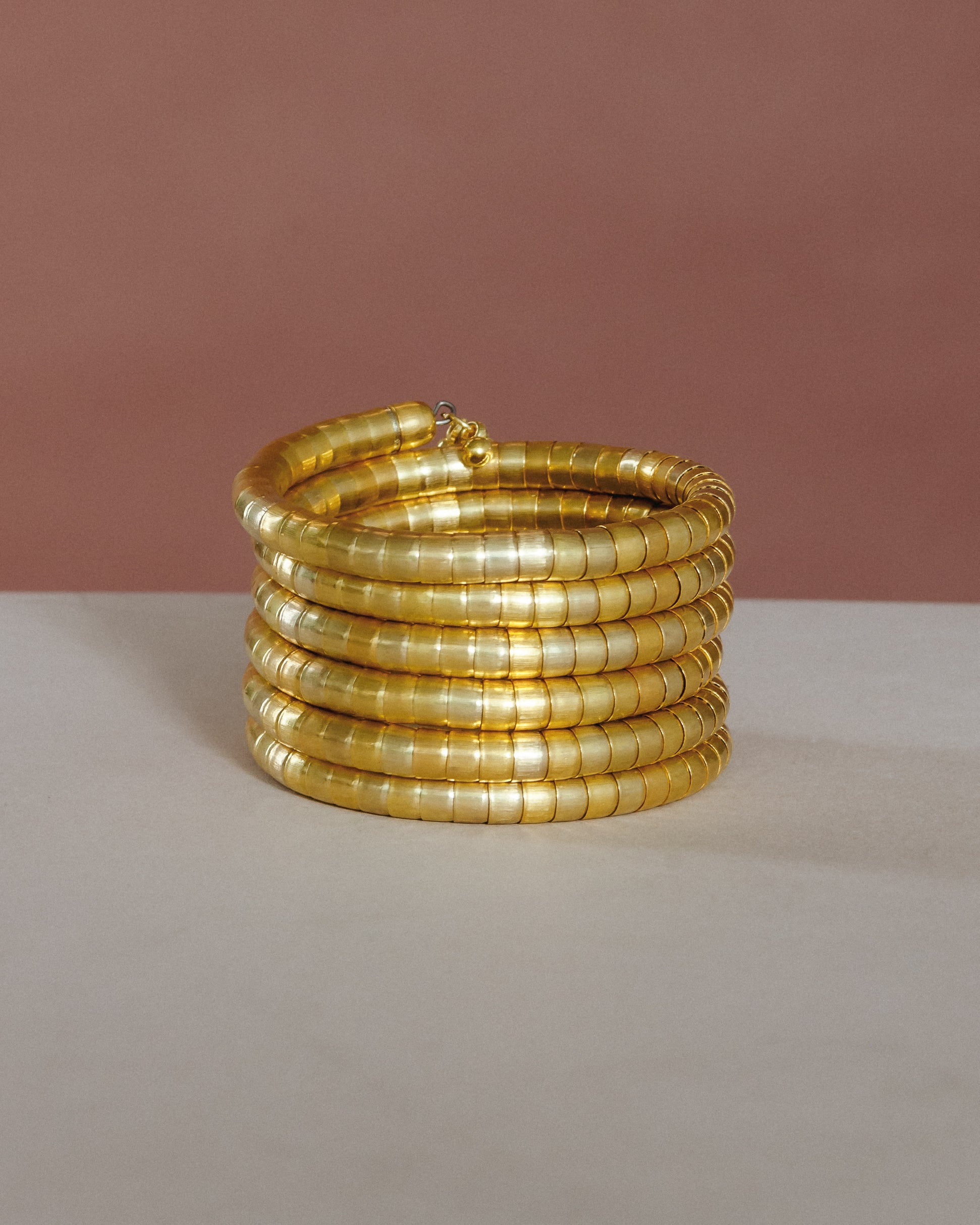 Discover the versatility and elegance of our Spiral Brass Gold Plated Bracelet Bangle. This stunning piece is crafted from high-quality brass and coated with a luxurious gold plating. Its adjustable spiral binding design allows it to be worn in multiple ways, making it a unique and functional accessory for any wardrobe.